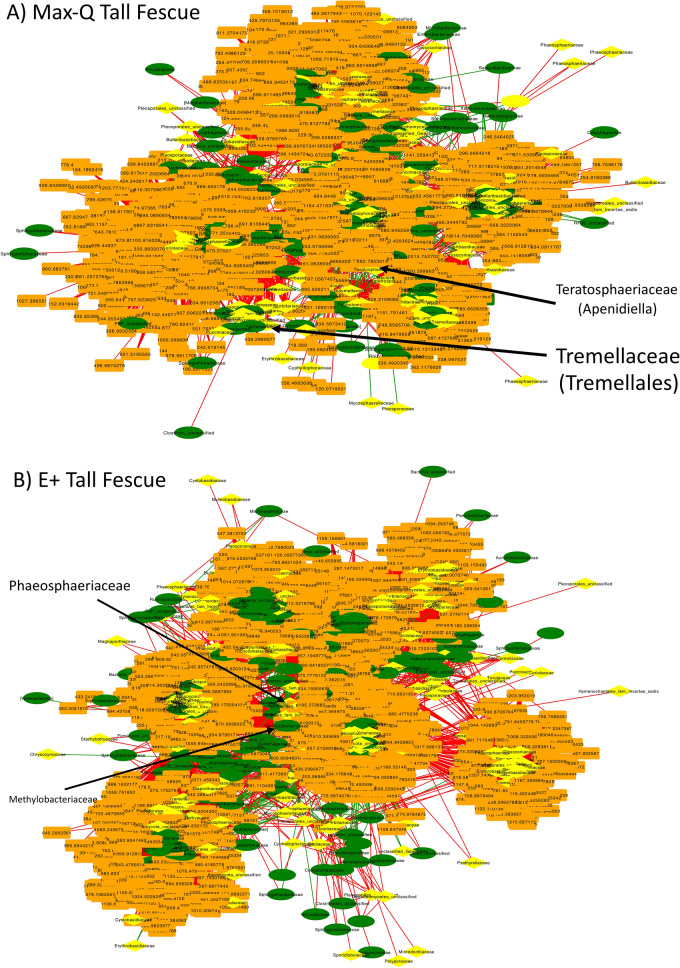Bovine fescue toxicosis (FT) is caused by grazing ergot alkaloid-producing endophyte (Epichloë coenophiala)-infected tall fescue. Endophyte's effects on the animal's microbiota and metabolism were investigated recently, but its effects in planta or on the plant-animal interactions have not been considered. We examined multi-compartment microbiota-metabolome perturbations using multi-'omics (16S and ITS2 sequencing, plus untargeted metabolomics) in Angus steers grazing non-toxic (Max-Q) or toxic (E+) tall fescue for 28 days and in E+ plants. E+ altered the plant/animal microbiota, decreasing most ruminal fungi, with mixed effects on rumen bacteria and fecal microbiota. Metabolic perturbations occurred in all matrices, with some plant-animal overlap (e.g., Vitamin B6 metabolism). Integrative interactomics revealed unique E+ network constituents. Only E+ had ruminal solids OTUs within the network and fecal fungal OTUs in E+ had unique taxa (e.g., Anaeromyces). Three E+-unique urinary metabolites that could be potential biomarkers of FT and targeted therapeutically were identified.