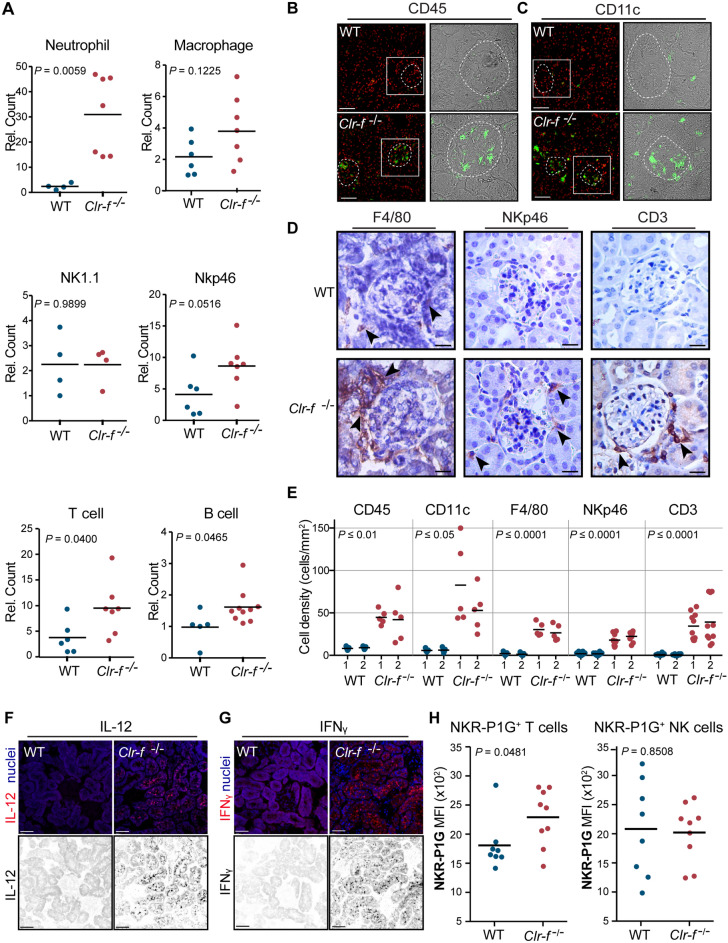 The C-type lectin-related protein, Clr-f, encoded by Clec2h in the mouse NK gene complex (NKC), is a member of a family of immune regulatory lectins that guide immune responses at distinct tissues of the body. Clr-f is highly expressed in the kidney; however, its activity in this organ is unknown. To assess the requirement for Clr-f in kidney health and function, we generated a Clr-f-deficient mouse (Clr-f-/-) by targeted deletions in the Clec2h gene. Mice lacking Clr-f exhibited glomerular and tubular lesions, immunoglobulin and C3 complement protein renal deposits, and significant abdominal and ectopic lipid accumulation. Whole kidney transcriptional profile analysis of Clr-f-/- mice at 7, 13, and 24 weeks of age revealed a dynamic dysregulation in lipid metabolic processes, stress responses, and inflammatory mediators. Examination of the immune contribution to the pathologies of Clr-f-/- mouse kidneys identified elevated IL-12 and IFNγ in cells of the tubulointerstitium, and an infiltrating population of neutrophils and T and B lymphocytes. The presence of these insults in a Rag1-/-Clr-f-/- background reveals that Clr-f-/- mice are susceptible to a T and B lymphocyte-independent renal pathogenesis. Our data reveal a role for Clr-f in the maintenance of kidney immune and metabolic homeostasis.