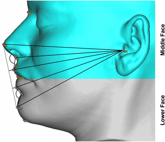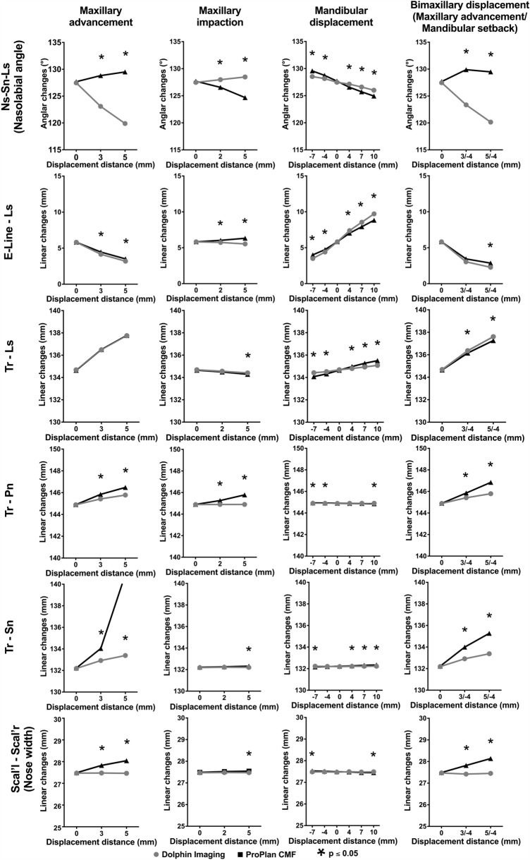The aim of this study was to compare the soft tissue predicative abilities of two established programs depending on the surgical technique and amount of displacement. On the basis of 50 computed tomography images, 11 orthognathic operations with differences in displacement distances and technique (maxillary advancement, MxA; maxillary impaction, MxI; mandibular setback, MnS; mandibular advancement, MnA bimaxillary displacement, MxA/MnS) as well as corresponding soft tissue predictions were simulated using the programs Dolphin (D) and ProPlan (PP). For all the soft tissue predictions by the two programs, eight linear and two angular measurements were performed and compared. The simulation of maxillary impaction showed a similar soft tissue behaviour between the two programs. However, differences or divergent behaviours were observed for other procedures. In the middle third of the face these significant differences concerned in particular the nasolabial angle (Ns-Sn-Ls)(5 mm-MA, D: 119.9 ± 8.6° vs. PP: 129.5 ± 8.4°; 7 mm-MnS: D: 128.5 ± 8.2° vs. PP: 129.6 ± 8.1°; 10 mm-MnA D: 126.0 ± 8.0° vs. PP: 124.9 ± 8.4°; 5 mm-MxA/4 mm-MnS, D: 120.2 ± 8.7° vs. PP: 129.9 ± 8.3°; all p < 0.001) and in the lower third the mentolabial angle (Pog´-B´-Li) (5 mm-MA, D: 133.2 ± 11.4° vs. PP: 126.8 ± 11.6°; 7 mm-MnS: D: 133.1 ± 11.3° vs. PP: 124.6 ± 11.9°; 10 mm-MnA D: 133.3 ± 11.5° vs. PP: 146.3 ± 11.1°; bignathic 5 mm-MxA/4 mm-MnS, D: 133.1 ± 11.4° vs. PP: 122.7 ± 11.9°; all p < 0.001) and the distance of the inferior lip to the aesthetic Line (E-Line-Li) (5 mm-MA, D: 3.7 ± 2.3 mm vs. PP: 2.8 ± 2.5 mm; 7 mm-MnS: D: 5.1 ± 3.0 mm vs. PP: 3.3 ± 2.3 mm; 10 mm-MnA D: 2.5 ± 1.6 mm vs. PP: 3.9 ± 2.8 mm; bignathic 5 mm-MxA/4 mm-MnS, D: 4.8 ± 3.0 mm vs. PP: 2.9 ± 2.0 mm; all p < 0.001). The soft tissue predictions by the tested programs differed in simulation outcome, which led to the different, even divergent, results. However, the significant differences are often below a clinically relevant level. Consequently, soft tissue prediction must be viewed critically, and its actual benefit must be clarified.