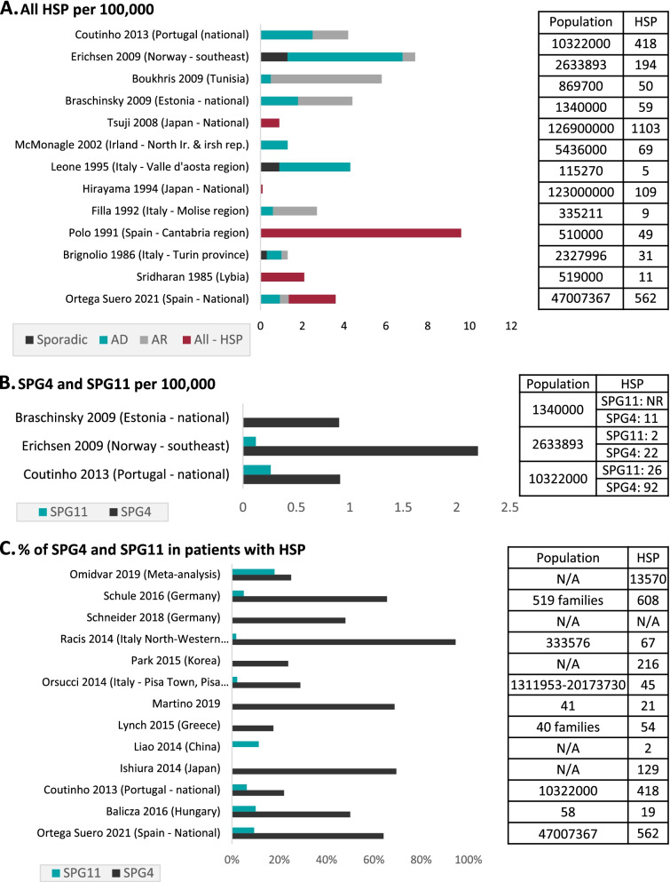Results: The HSP global prevalence was estimated to be 3.6 per 100,000 for all HSP forms, whilst the estimated global prevalence per genetic subtype was 0.90 (SPG4), 0.22 (SPG7), 0.34 (SPG11), and 0.13 (SPG15), respectively. This equates to an estimated 3365 (SPG4) and 872 (SPG11) symptomatic patients, respectively, in the USA.