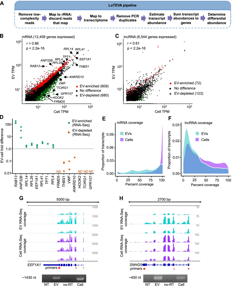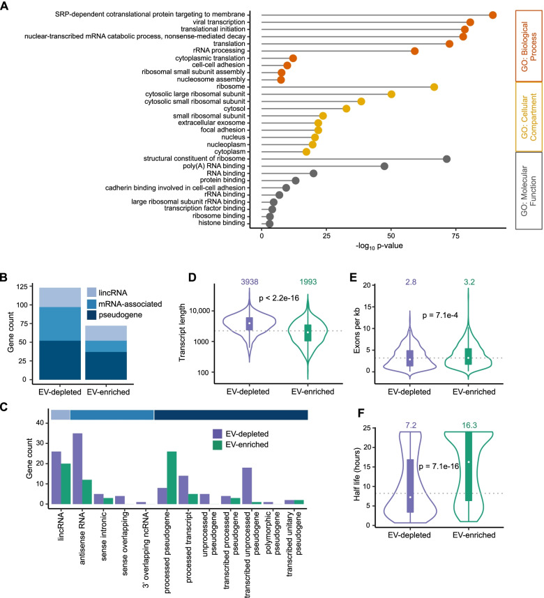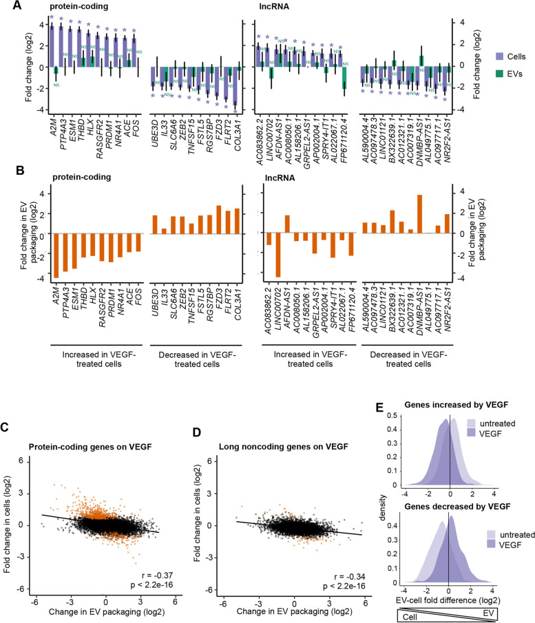 Results: In basal conditions, long RNA transcripts enriched in EVs have longer than average half-lives and distinctive stability-related sequence and structure characteristics including shorter transcript length, higher exon density, and fewer 3' UTR A/U-rich elements. EV-enriched long RNA transcripts are also enriched in HNRNPA2B1 binding motifs and are impacted by HNRNPA2B1 depletion, implicating this RNA-binding protein in the sorting of long RNA to EVs. After signaling-dependent modification of the cellular transcriptome, we observed that, unexpectedly, the rate of EV enrichment relative to cells was altered for many mRNA and lncRNA transcripts. This change in EV enrichment was negatively correlated with intracellular abundance, with transcripts whose export to EVs increased showing decreased abundance in cells and vice versa. Correspondingly, after treatment with inhibitors of EV secretion, levels of mRNA and lncRNA transcripts that are normally highly exported to EVs increased in cells, indicating a measurable impact of EV export on the long RNA transcriptome of the exporting cells. Compounds with different mechanisms of inhibition of EV secretion affected the cellular transcriptome differently, suggesting the existence of multiple EV subtypes with different long RNA profiles.