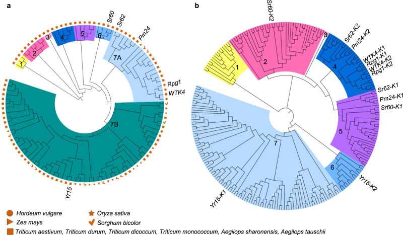The wild relatives and progenitors of wheat have been widely used as sources of disease resistance (R) genes. Molecular identification and characterization of these R genes facilitates their manipulation and tracking in breeding programmes. Here, we develop a reference-quality genome assembly of the wild diploid wheat relative Aegilops sharonensis and use positional mapping, mutagenesis, RNA-Seq and transgenesis to identify the stem rust resistance gene Sr62, which has also been transferred to common wheat. This gene encodes a tandem kinase, homologues of which exist across multiple taxa in the plant kingdom. Stable Sr62 transgenic wheat lines show high levels of resistance against diverse isolates of the stem rust pathogen, highlighting the utility of Sr62 for deployment as part of a polygenic stack to maximize the durability of stem rust resistance.