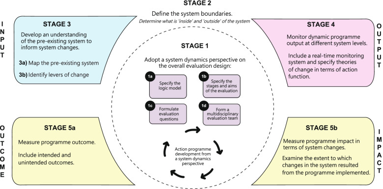 Results: The ENCOMPASS framework includes five iterative stages: (1) adopting a system dynamics perspective on the overall evaluation design; (2) defining the system boundaries; (3) understanding the pre-existing system to inform system changes; (4) monitoring dynamic programme output at different system levels; and (5) measuring programme outcome and impact in terms of system changes.