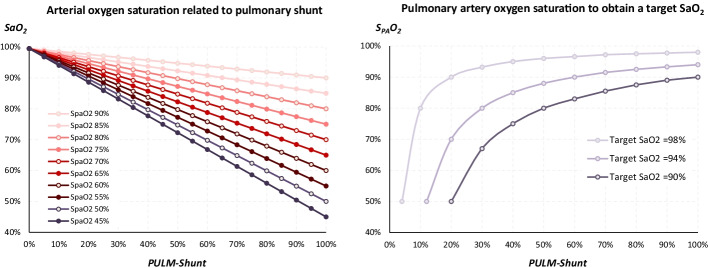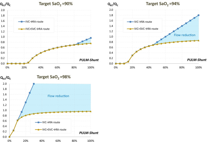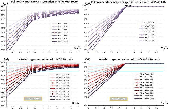 Results: With the IVC → RA route, SPAO2 and SaO2 increased linearly with QEC/QC until the threshold of the IVC flow/QC ratio, beyond which the increase in SPAO2 reached a plateau. With the IVC + SVC → RA route, SPAO2 and SaO2 increased linearly with QEC/QC until 100% with QEC/QC = 1. The difference in required QEC/QC between the two routes was all the higher as SaO2 target or PULM-Shunt were high, and occurred all the earlier as PULM-Shunt were high. The required QEC between the two routes could differ from 1.0 L/min (QC = 5 L/min) to 1.5 L/min (QC = 8 L/min) for SaO2 target = 90%. Corresponding differences of QEC for SaO2 target = 94% were 4.7 L/min and 7.9 L/min, respectively.