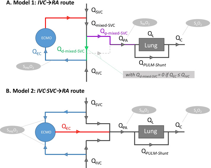 Method: Two mathematical models were built to simulate the inferior vena cava-to-right atrium (IVC → RA) route and the bicaval drainage-to-right atrium return (IVC + SVC → RA) route using the following parameters: cardiac output (QC), IVC flow/QC ratio, venous oxygen saturation, extracorporeal pump flow (QEC), and pulmonary shunt (PULM-Shunt) to obtain pulmonary artery oxygen saturation (SPAO2) and systemic blood oxygen saturation (SaO2).