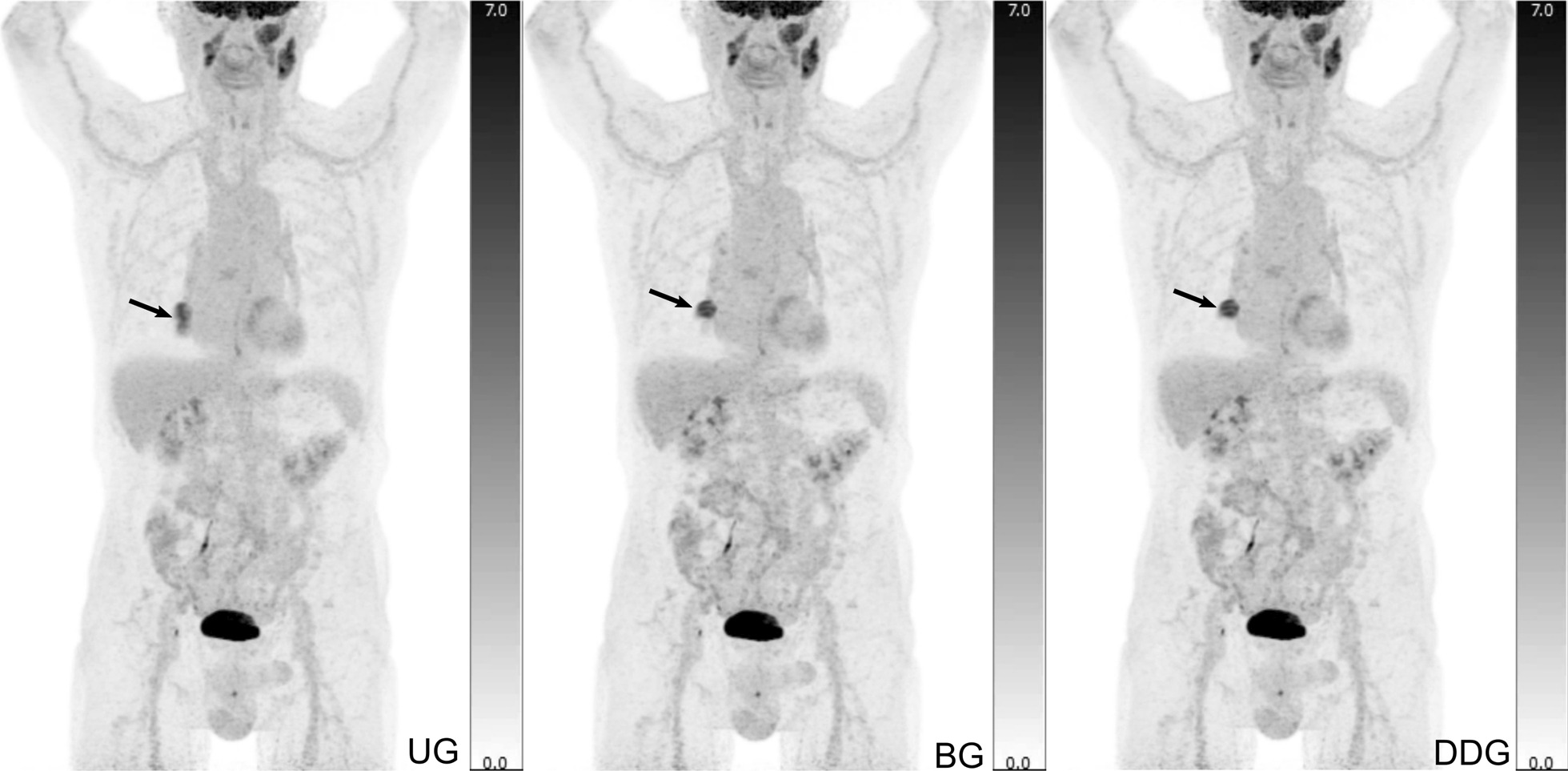 Results: Placement of the belt needed for BG was associated with problems in 27% of the BG scans, whereas no issues were reported using DDG imaging. For lesion quantification, DDG and BG images had significantly greater SUV values and smaller volumes than UG. The physicians reported notable image blurring in 44% of the UG images that was problematic for clinical evaluation in 4.5% of cases.