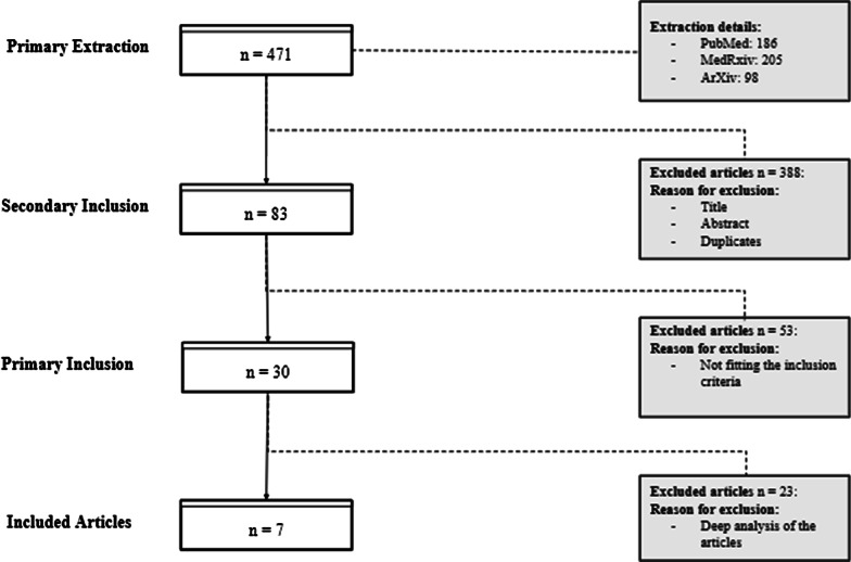 Results: We first obtained 471 unique articles from a search conducted in PubMed, MedRxiv and arXiv databases. 30 of these were effectively reviewed, based on our inclusion and exclusion criteria. 23 articles were excluded in the full review stage, resulting in the analysis of 7 papers that fully correspond to our inclusion criteria. Included papers pursued a variety of objectives and used distinct methods to evaluate their embeddings and to visualize them. Visualization also served heterogeneous purposes, being alternatively used as a way to explore the embeddings, to evaluate them or to merely illustrate properties otherwise formally assessed.
