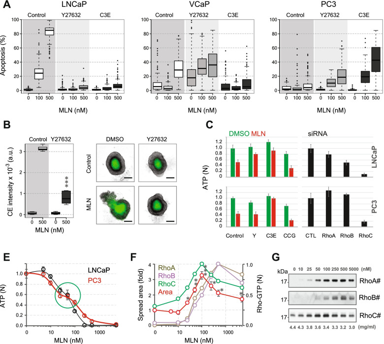 Results: We show that mechanical stress induced by MLN4924 in prostate cancer cells significantly affects the therapeutic outcome. The latter depends on the cell type and involves distinct Rho isoforms. In LNCaP and VCaP cells, the stimulation of RhoA and RhoB by MLN4924 markedly upregulates the level of tight junction proteins at cell-cell contacts, which augments the mechanical strain induced by Rho signaling. This "tight junction stress response" (TJSR) causes the collapse of cell monolayers and a characteristic rupture of cancer spheroids. Notably, TJSR is a major cause of drug-induced apoptosis in these cells. On the other hand, in PC3 cells that underwent partial epithelial-to-mesenchymal transition (EMT), the stimulation of RhoC induces an adverse effect by promoting amoeboid cell scattering and invasion. We identified complementary targets and drugs that allow for the induction of TJSR without stimulating RhoC.