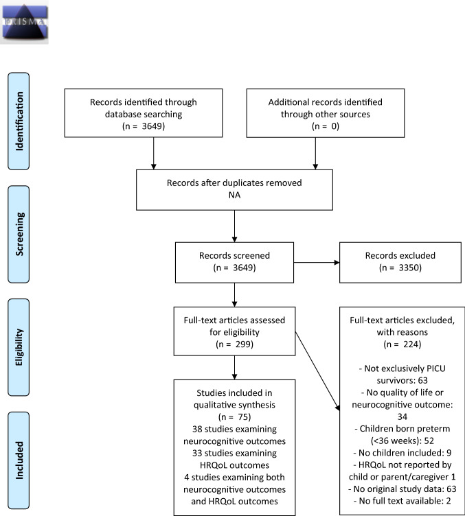 Data extraction: Of the 3649 identified studies, 299 met the inclusion criteria based on title abstract screening. After full-text screening, 75 articles were included in the qualitative data reviewing: 38 on neurocognitive functioning, 33 on HRQoL, and 4 on both outcomes.