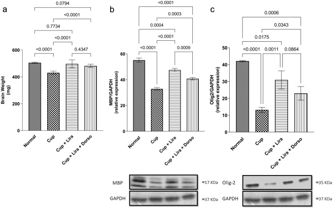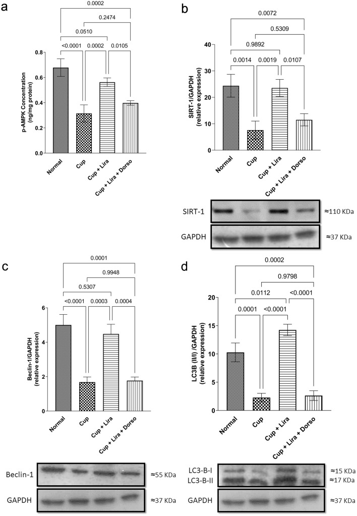 The heterogeneous nature of multiple sclerosis (MS) and the unavailability of treatments addressing its intricate network and reversing the disease state is yet an area that needs to be elucidated. Liraglutide, a glucagon-like peptide-1 analogue, recently exhibited intriguing potential neuroprotective effects. The currents study investigated its potential effect against mouse model of MS and the possible underlying mechanisms. Demyelination was induced in C57Bl/6 mice by cuprizone (400 mg/kg/day p.o.) for 5 weeks. Animals received either liraglutide (25 nmol/kg/day i.p.) or dorsomorphin, an AMPK inhibitor, (2.5 mg/Kg i.p.) 30 min before the liraglutide dose, for 4 weeks (starting from the second week). Liraglutide improved the behavioral profile in cuprizone-treated mice. Furthermore, it induced the re-myelination process through stimulating oligodendrocyte progenitor cells differentiation via Olig2 transcription activation, reflected by increased myelin basic protein and myelinated nerve fiber percentage. Liraglutide elevated the protein content of p-AMPK and SIRT1, in addition to the autophagy proteins Beclin-1 and LC3B. Liraglutide halted cellular damage as manifested by reduced HMGB1 protein and consequently TLR-4 downregulation, coupled with a decrease in NF-κB. Liraglutide also suppressed NLRP3 transcription. Dorsomorphin pre-administration indicated a possible interplay between AMPK/SIRT1 and NLRP3 inflammasome activation as it partially reversed liraglutide's effects. Immunohistochemical examination of Iba+ microglia emphasized these findings. In conclusion, liraglutide exerts neuroprotection against cuprizone-induced demyelination via anti-inflammatory, autophagic flux activation, NLRP3 inflammasome suppression, and anti-apoptotic mechanisms, possibly mediated, at least in part, via AMPK/SIRT1, autophagy, TLR-4/ NF-κB/NLRP3 signaling. The potential mechanistic insight of Lira in alleviating Cup-induced neurotoxicity via: (1) AMPK/SIRT1 pathways activation resulting in the stimulation of brain autophagy flux (confirmed by lowering Beclin-1 and LC3-B protein expression). (2) Inhibition of NLRP3 inflammasome activation, as evidenced by reduced HMGB1, TLR-4, NF-κB and NLRP3 protein expression, alongside diminishing the activation of its downstream cascade as reflected by reduced levels of caspase-1 and IL-1β protein expression. (3) A possible modulating interplay between the previously mentioned two pathways.
