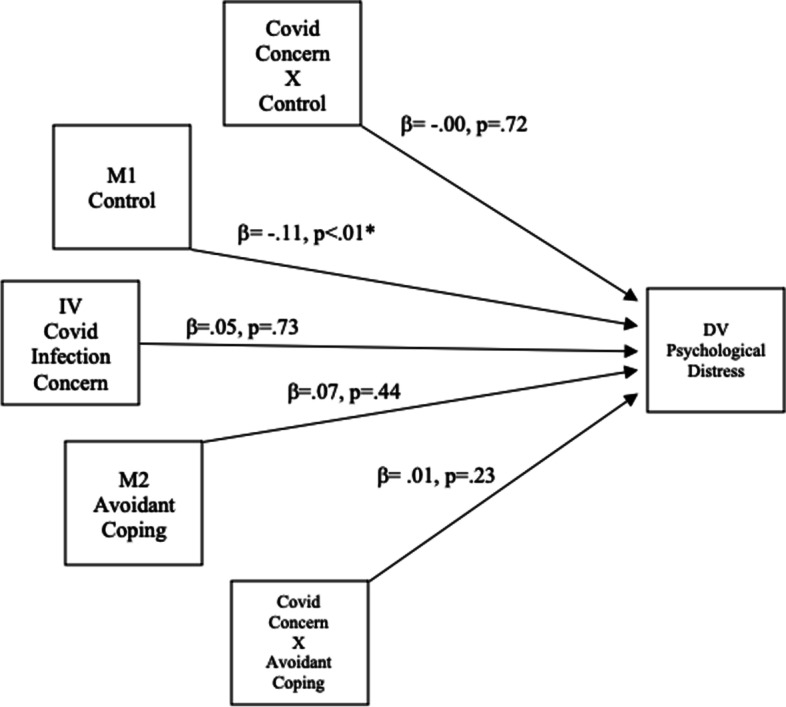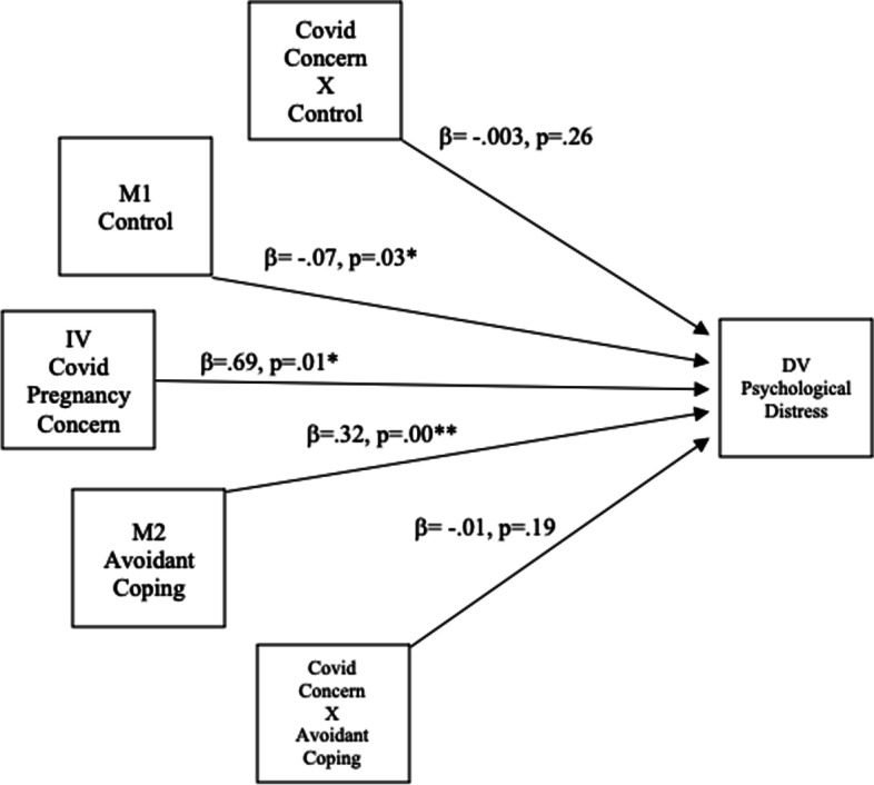 Results: Correlation analyses found that lower levels of perceived control were associated with higher levels of avoidant coping and psychological distress. There was also a significant positive relationship between avoidant coping and psychological distress. Using multiple regression, perceived control, avoidant coping and Covid-19 related pregnancy concern were found to predict 51% of the variance in psychological distress. However, in the moderation analysis, perceived control and avoidant coping were not found to moderate the relationship between Covid-19 related pregnancy concern and psychological distress.