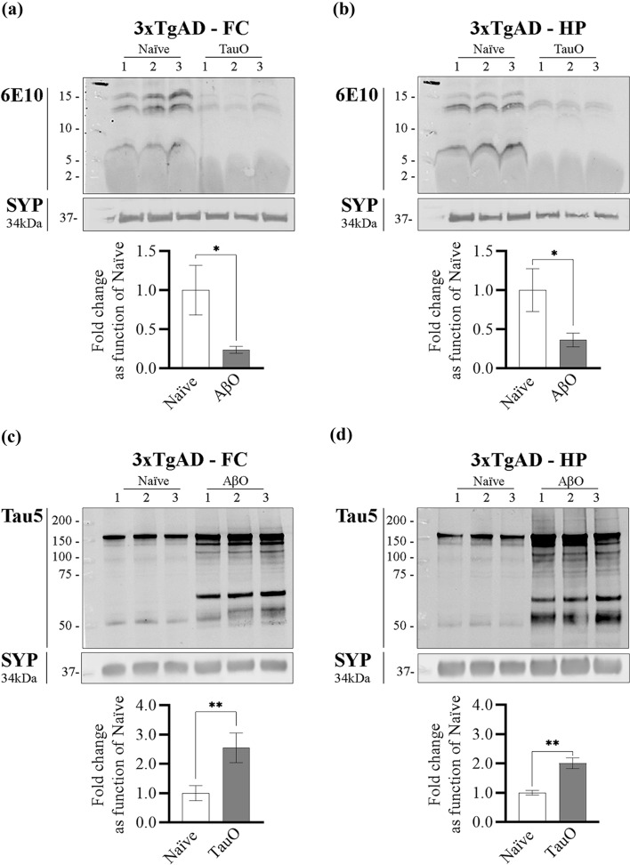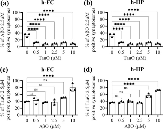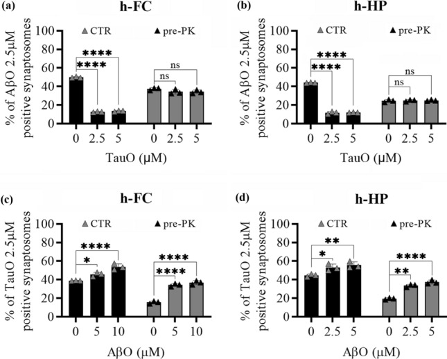 Results: We demonstrated that higher TauO concentrations effectively outcompete AβO and become the prevailing synaptic-associated species. Conversely, high concentrations of AβO facilitate synaptic TauO recruitment. Immunofluorescence analyses of mouse primary cortical neurons confirmed differential synaptic binding dynamics of AβO and TauO. Moreover, in vivo experiments using old 3xTgAD mice ICV injected with either AβO or TauO fully supported these findings. Consistent with these observations, FASS-LTP analyses demonstrated that TauO-induced suppression of chemical LTP was exacerbated by AβO. Finally, predigestion with proteinase K abolished the ability of TauO to compete off AβO without affecting the ability of high AβO levels to increase synaptic TauO recruitment. Thus, unlike AβO, TauO effects on synaptosomes are hampered by the absence of protein substrate in the membrane.