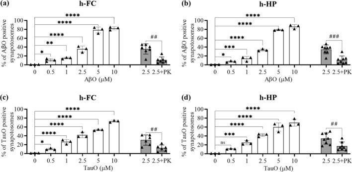 Methods: Binding of labeled, pre-formed Aβ and tau oligomers onto synaptosomes isolated from the hippocampus and frontal cortex of mouse and postmortem cognitively intact elderly human brains was evaluated using flow-cytometry and western blot analyses. Binding of labeled, pre-formed Aβ and tau oligomers onto mouse primary neurons was assessed using immunofluorescence assay. The synaptic dysfunction was measured by fluorescence analysis of single-synapse long-term potentiation (FASS-LTP) assay.