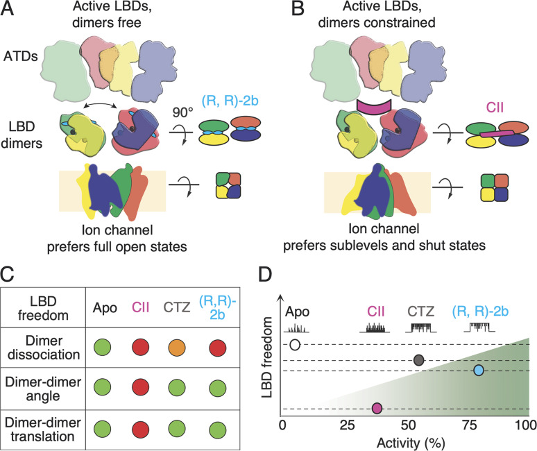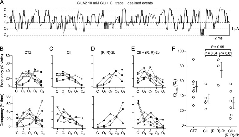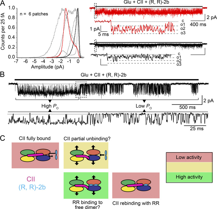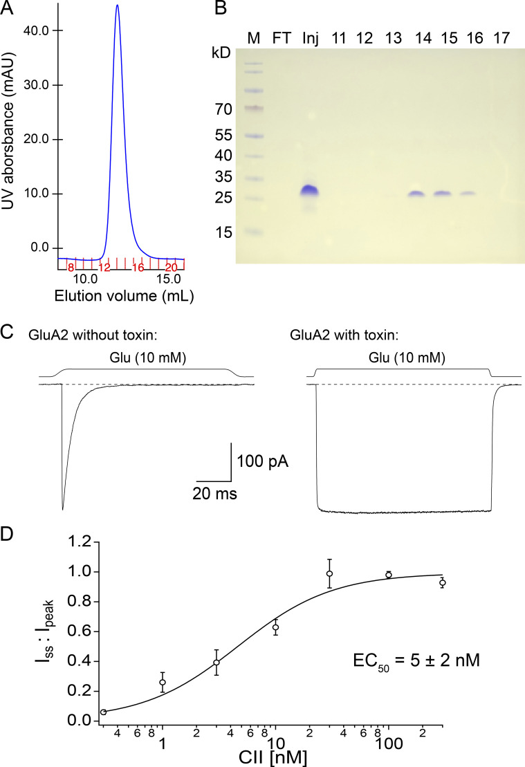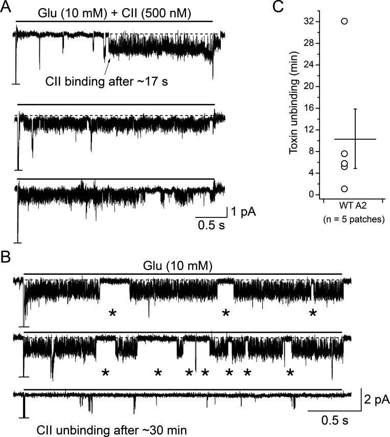 Conotoxins are a large group of naturally occurring toxic peptides produced by the predatory sea snails of the genus Conus. Many of these toxins target ion channels, often with high specificity and affinity. As such, they have proven to be invaluable for basic research, as well as acting as leads for therapeutic strategies. Con-ikot-ikot is the only conotoxin so far identified that targets AMPA-type glutamate receptors, the main mediators of excitatory neurotransmission in the vertebrate brain. Here, we describe how the toxin modifies the activity of AMPA receptors at the single-channel level. The toxin binds to the AMPA receptor with EC50 of 5 nM, and once bound takes minutes to wash out. As shown previously, it effectively blocks desensitization of AMPA receptors; however, compared to other desensitization blockers, it is a poor stabilizer of the open channel because toxin-bound AMPA receptors undergo frequent brief closures. We propose that this is a direct consequence of the toxin's unique binding mode to the ligand-binding domains (LBDs). Unlike other blockers of desensitization, which stabilize individual dimers within an AMPA receptor tetramer, the toxin immobilizes all four LBDs of the tetramer. This result further emphasizes that quaternary reorganization of independent LBD dimers is essential for the full activity of AMPA receptors.