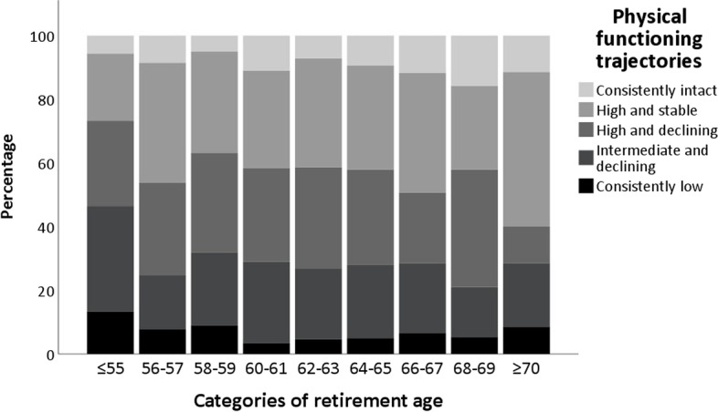 Results: A one-year increase in retirement age was associated with decreased likelihood of being classified in the 'consistently low' (fully adjusted mOR = 0.82; 95%CI = 0.70, 0.97; P = 0.007), 'intermediate and declining' (mOR = 0.89; 95%CI = 0.83, 0.96; P = 0.002), and 'high and declining' (mOR = 0.92; 95%CI = 0.87, 0.98; P = 0.006) trajectories, relative to the 'intact' PF trajectory. Compared to old age pensioners, disability pensioners were more likely to be classified in the 'consistently low' (mOR = 23.77; 95% CI 2.13, 265.04; P = 0.010), 'intermediate and declining' (mOR = 8.24; 95%CI = 2.58, 26.35; P < 0.001), and 'high and declining' (mOR = 2.71; 95%CI = 1.17, 6.28; P = 0.020) PF trajectories, relative to the 'intact' PF trajectory.