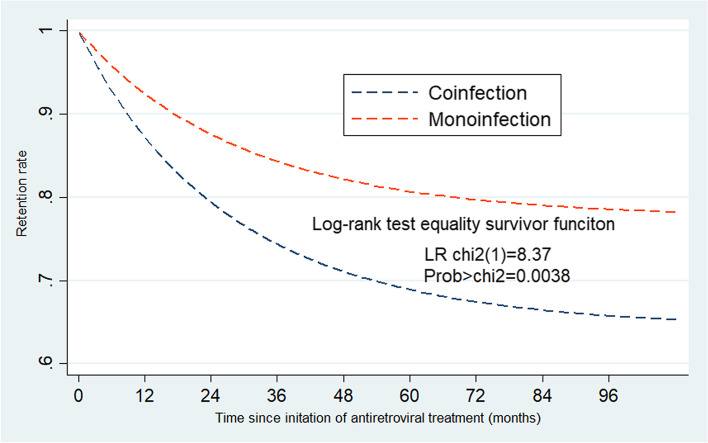 Conclusions: We observed that coinfected individuals are less likely to stay on ART than HIV monoinfected individuals. The low retention in the coinfected group from this study may affect the success of survival gained in people living with HIV (PLHIV) in the long term. More concerted efforts need to be made to retain coinfected individuals at least at the level of monoinfected persons on long-term ART care. Future studies are needed to better understand the difference in retention, preferable in a prospective manner.