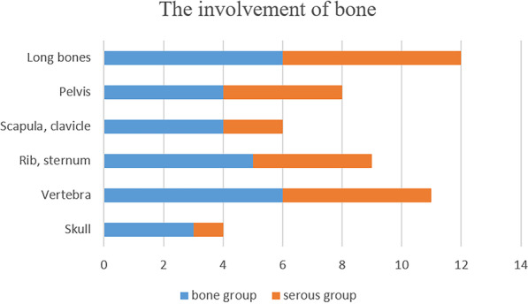 Results: Of the 23 patients with GSS enrolled, 13 were in the bone group and 10 in the serous group. The median disease duration was shorter and exercise tolerance was lower in the serous group. Despite less frequent bone pain in the serous group, the frequency of bone involvement was similar to that in the bone group. Patients in the serous group had higher rates of bilateral pleural effusion and multiple serous effusion. However, serous effusion also developed with disease progression in the bone group. Of the 17 patients treated with bisphosphonates, 14 reached bone-stable state. However, 5 out of 10 patients with serous effusion still had refractory effusions after bisphosphonates treatment. Three patients received sirolimus treatment, with an improvement in serous effusion. Seventeen patients were followed up; three patients died, two in the bone group and one in the serous group.