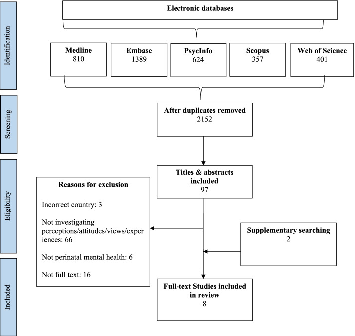 Results: Eight studies were included. Five overarching themes comprising 17 sub-categories were identified. These descriptive themes were: perceived causes of PMH, perceived symptoms of PMH, perceptions of motherhood, accessing PMH care and emotional sharing and coping strategies. Sociocultural expectations underpin many of the themes identified in this review including the importance of familial and societal causes of PMH, emphasis on physical symptoms, sacredness of motherhood, lack of awareness, stigma, shame, limited resources allocated for mental health and lack of emotional sharing.