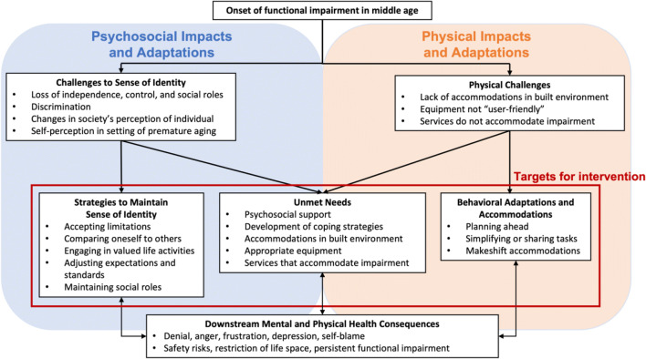 Key results: Interviews revealed several themes related to the psychosocial and physical impacts of developing functional impairment in middle age. Participants noted that losses associated with functional impairment, such as loss of independence, control, and social roles, caused conflict in their sense of identity. To cope with these losses, participants used strategies including acceptance, social comparison, adjusting standards, and engaging in valued life activities. Participants reflected on the intersection of their functional impairment with the aging process, noting that their impairments seemed premature compared to the more "natural" aging process in older adults. In terms of physical impacts, participants described how a lack of accommodations in the built environment exacerbated their impairments. While participants used behavioral strategies to overcome these challenges, unmet needs remained, resulting in downstream physical and psychological impacts including safety risks, falls, frustration, and fear.
