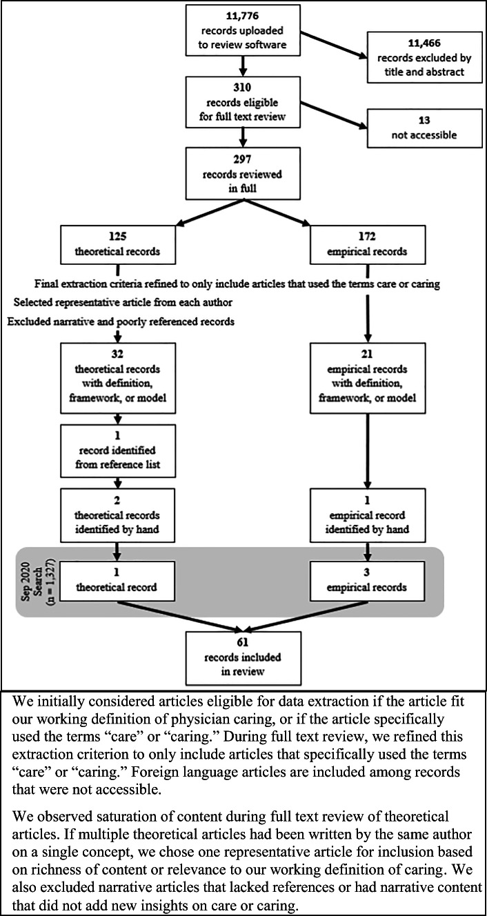 Methods: We performed a scoping review on physician caring. In November 2019 and September 2020, we searched PubMed MEDLINE, Embase, PsycINFO, CINAHL, and CENTRAL Register of Controlled Trials to identify conceptual models, frameworks, and definitions of physician caring. Eligible articles involved discussion or study of care or caring among medical practitioners. We created a content summary and performed thematic analysis of extracted data.