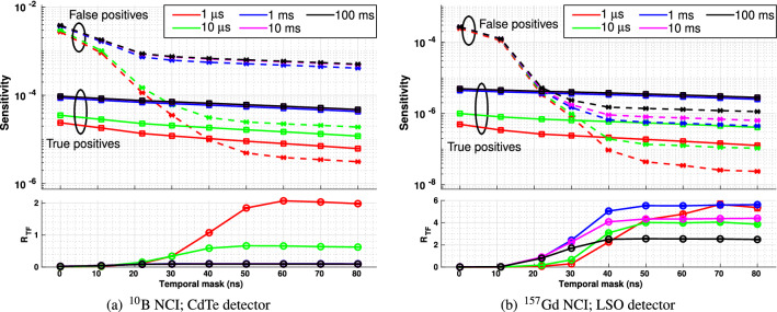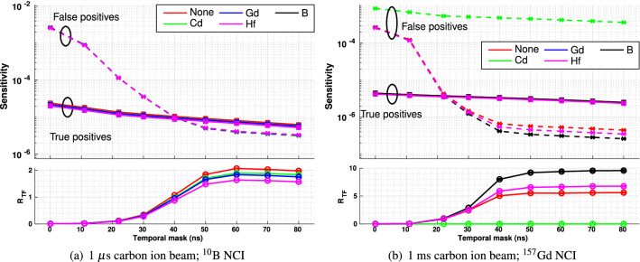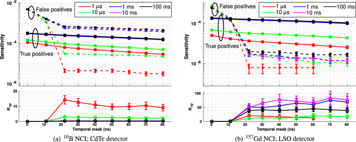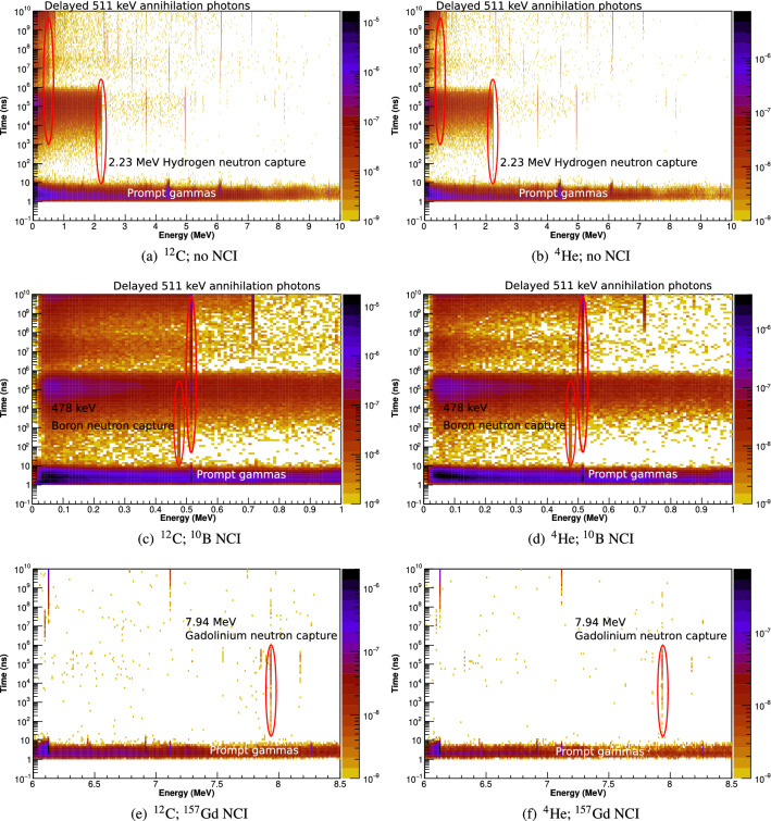 Neutron Capture Enhanced Particle Therapy (NCEPT) boosts the effectiveness of particle therapy by capturing thermal neutrons produced by beam-target nuclear interactions in and around the treatment site, using tumour-specific [Formula: see text]B or [Formula: see text]Gd-based neutron capture agents. Neutron captures release high-LET secondary particles together with gamma photons with energies of 478 keV or one of several energies up to 7.94 MeV, for [Formula: see text]B and [Formula: see text]Gd, respectively. A key requirement for NCEPT's translation is the development of in vivo dosimetry techniques which can measure both the direct ion dose and the dose due to neutron capture. In this work, we report signatures which can be used to discriminate between photons resulting from neutron capture and those originating from other processes. A Geant4 Monte Carlo simulation study into timing and energy thresholds for discrimination of prompt gamma photons resulting from thermal neutron capture during NCEPT was conducted. Three simulated [Formula: see text] mm[Formula: see text] cubic PMMA targets were irradiated by [Formula: see text]He or [Formula: see text]C ion beams with a spread out Bragg peak (SOBP) depth range of 60 mm; one target is homogeneous while the others include [Formula: see text] mm[Formula: see text] neutron capture inserts (NCIs) of pure [Formula: see text]B or [Formula: see text]Gd located at the distal edge of the SOBP. The arrival times of photons and neutrons entering a simulated [Formula: see text] mm[Formula: see text] ideal detector were recorded. A temporal mask of 50-60 ns was found to be optimal for maximising the discrimination of the photons resulting from the neutron capture by boron and gadolinium. A range of candidate detector and thermal neutron shielding materials were simulated, and detections meeting the proposed acceptance criteria (i.e. falling within the target energy window and arriving 60 ns post beam-off) were classified as true or false positives, depending on their origin. The ratio of true/false positives ([Formula: see text]) was calculated; for targets with [Formula: see text]B and [Formula: see text]Gd NCIs, the detector materials which resulted in the highest [Formula: see text] were cadmium-shielded CdTe and boron-shielded LSO, respectively. The optimal irradiation period for both carbon and helium ions was 1 µs for the [Formula: see text]B NCI and 1 ms for the [Formula: see text]Gd NCI.