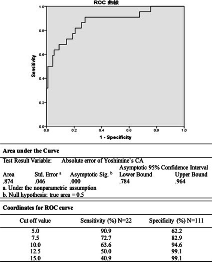 Results: There were 111 and 22 hips in the ROM (+) and ROM (-) groups, respectively. A significant difference was noted in the absolute error of Yoshimine's and Widmer's CA between the two groups. Using receiver operating characteristic analysis, threshold values of 6.0 (higher values indicate greater disability; sensitivity 90.9%, specificity 72.1%) for the absolute Yoshimine's CA difference (area under the curve [AUC] 0.87, P < 0.01) and 6.9 (higher values indicate greater disability; sensitivity 68.2%, specificity 88.3%) for the absolute Widmer's CA difference (AUC 0.83, P < 0.01) were predictors in the ROM (-) group.