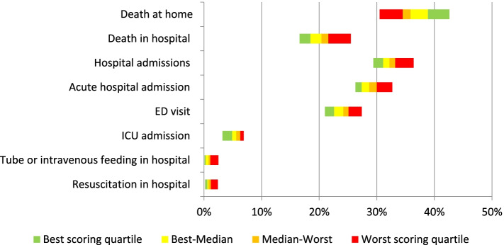 Methods: A retrospective nationwide population-based observational study was conducted, using routinely collected administrative data concerning persons who died in 2017 in the Netherlands with underlying causes relevant for palliative care (N = 109,707). Data from four registries were linked for analysis. Scores on eight quality indicators concerning place of death and hospital care utilization were calculated, and compared across 31 healthcare insurance regions to establish relative benchmarks.