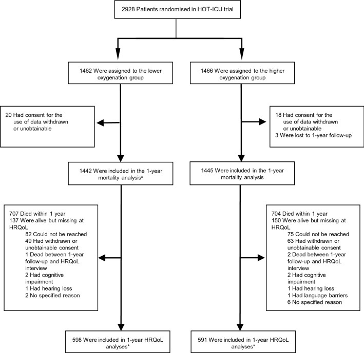 Results: We obtained 1-year vital status for 2887/2928 (98.6%), and HRQoL for 2600/2928 (88.8%) of the trial population. One year after randomisation, 707/1442 patients (49%) in the lower oxygenation group vs. 704/1445 (48.7%) in the higher oxygenation group had died (adjusted risk ratio 1.00; 95% confidence interval 0.93-1.08, p = 0.92). In total, 1189/1476 (80.4%) 1-year survivors participated in HRQoL interviews: median EQ-VAS scores were 65 (interquartile range 50-80) in the lower oxygenation group versus 67 (50-80) in the higher oxygenation group (p = 0.98). None of the five EQ-5D-5L dimensions differed between groups.