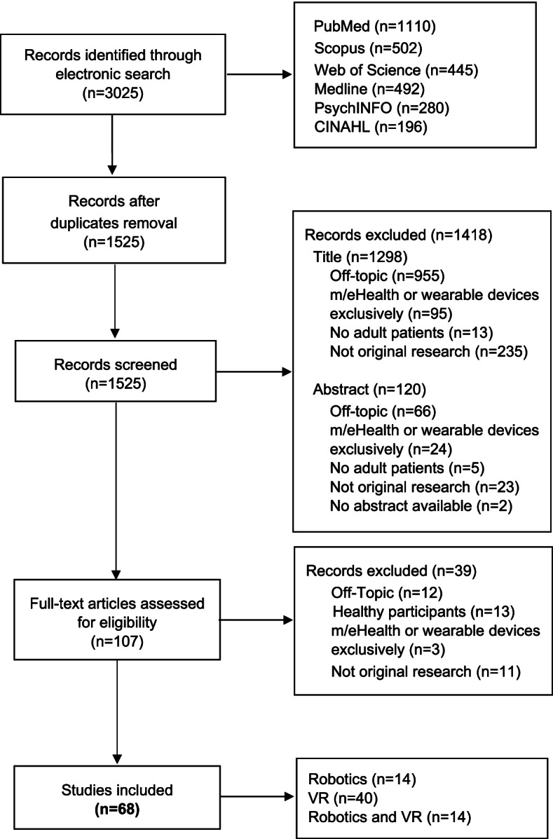 Results: Sixty-eight studies were included. VR devices were perceived as having good usability and as a tool promoting patients' engagement and motivation during the treatment, as well as providing strong potential for customized rehabilitation sessions. By contrast, they suffered from the effect of learnability and were judged as potentially requiring more mental effort. Robotics implementation received positive feedback along with high satisfaction and perceived safety throughout the treatment. Robot-assisted rehabilitation was considered useful as it supported increased treatment intensity and contributed to improved patients' physical independence and psychosocial well-being. Technical and design-related issues may limit the applicability making the treatment difficult and physically straining. Moreover, cognitive and communication deficits were remarked as potential barriers.