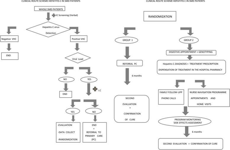 Methods: An open, randomized, controlled trial with blinded outcome assessment. The intervention group will engage in a nurse navigation program designed by mental health nurses. The program involves active screening for patients with severe mental disorder. The patients and caregivers included in the program will receive information, training, support and guidance throughout the treatment and recovery process, which involves different healthcare professionals and units. The control group will receive the standard of care, which includes follow-up by a family physician, referral to the hepatologist, serological testing, new referral to the hepatologist, onset of treatment, and follow-up. Multidisciplinary care will be provided along a coordinated and seamless clinical pathway led by a nurse navigator. The primary endpoints are total recovery (hepatitis C cure) and treatment adherence. Occurrence of symptoms of schizophrenia and health-related quality of life will be also recorded. Follow-up of patients will be performed three and six months after the administration of antiviral treatment. The study was authorised by the Ethics Committee of Malaga in December 2021. Funding was approved in March 2021.