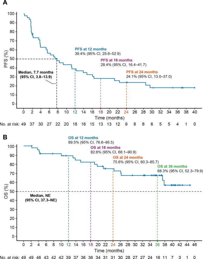 Results: At a median follow-up of 32.7 months, the ORR was 34.7% (17/49 patients); 3/49 patients (6.1%) had a complete response. Of the 17 patients with response, 14 remained in response for >6 months, and 6 remained in response for >24 months. Median PFS was 7.7 months (95% CI 3.8 to 13.9), and median OS was not reached (95% CI 37.3 to not reached). Ninety-eight per cent (48/49) of patients experienced ≥1 treatment-related adverse event (TRAE) and 38.8% (19/49) had grade 3/4 TRAEs, most commonly syncope (8.2%; 4/49) and increased lipase (6.1%; 3/49). No association between exploratory biomarkers and ORR was observed. Limitations include the small sample size and single-arm design.