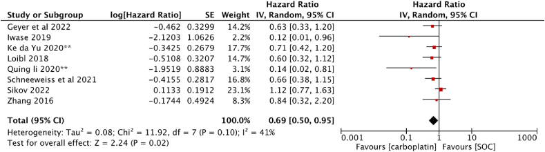 Results: Eight trials with 2425 patients were included. Carboplatin improved DFS (HR 0.60; 95% CI 0.47 to 0.78; I2 45%, p < 0.001) compared with AT at trial level and IPD level (HR 0.66; 95%CI, 0.55 to 0.80, p < 0.001) analysis. The OS also improved with carboplatin at both trial level (HR 0.69, 95%CI 0.50 to 0.95, I2 41%, p = 0.02) and IPD level (HR 0.68; 95%CI, 0.54 to 0.87, p = 0.002) analysis. The pCR as expected, was better in the carboplatin arm (OR 2.11; 95% CI = 1.44-3.08; I2 67%, p = 0.009). Anaemia and thrombocytopaenia were higher in the carboplatin arm.