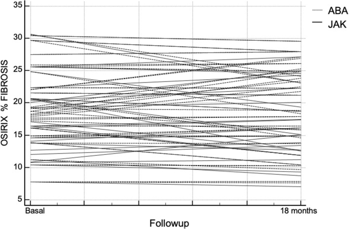 Methods: Patients with RA-ILD receiving JAKis or ABA were retrospectively evaluated at baseline and after 18 months of treatment. A computer-aided method (CaM) was used to assess the extent of high-resolution computed tomography (HRCT) fibrosis percentage. According to HRCT fibrosis changes, patients were classified as "worsened" (progression of 15% or more), "stable" (changes within 15%) or "improved" (reduction of 15% or more). Correlations between RA characteristics and JAKis or ABA responses were studied using a multivariate regression model.
