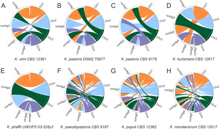 Results: Growth tests on different carbon sources and in the presence of stressors at two different temperatures allowed us to identify strains with differences in tolerance to high pH, high temperature, and growth on xylose. As Komagataella species are generally not considered xylose-utilizing yeasts, xylose assimilation was characterized in detail. Growth assays, enzyme activity measurements and 13C labeling confirmed the ability of K. phaffii to utilize D-xylose via the oxidoreductase pathway. In addition, we performed long-read whole-genome sequencing to generate genome assemblies of all Komagataella species type strains and additional K. phaffii and K. pastoris isolates for comparative analysis. All sequenced genomes have a similar size and share 83-99% average sequence identity. Genome structure analysis showed that K. pastoris and K. ulmi share the same rearrangements in difference to K. phaffii, while the genome structure of K. kurtzmanii is similar to K. phaffii. The genomes of the other, more distant species showed a larger number of structural differences. Moreover, we used the newly assembled genomes to identify putative orthologs of important xylose-related genes in the different Komagataella species.