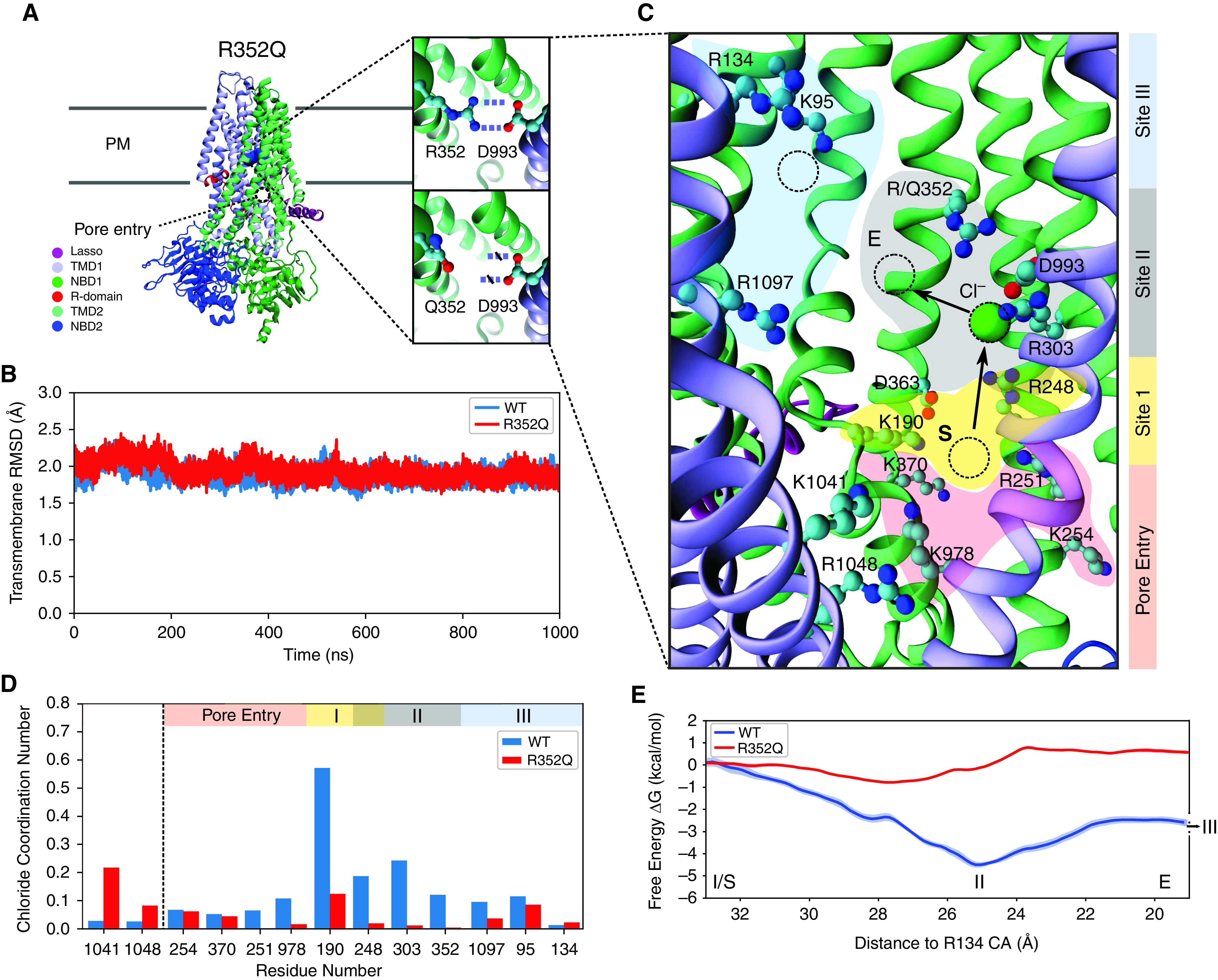 A significant challenge to making targeted cystic fibrosis transmembrane conductance regulator (CFTR) modulator therapies accessible to all individuals with cystic fibrosis (CF) are many mutations in the CFTR gene that can cause CF, most of which remain uncharacterized. Here, we characterized the structural and functional defects of the rare CFTR mutation R352Q, with a potential role contributing to intrapore chloride ion permeation, in patient-derived cell models of the airway and gut. CFTR function in differentiated nasal epithelial cultures and matched intestinal organoids was assessed using an ion transport assay and forskolin-induced swelling assay, respectively. CFTR potentiators (VX-770, GLPG1837, and VX-445) and correctors (VX-809, VX-445, with or without VX-661) were tested. Data from R352Q-CFTR were compared with data of 20 participants with mutations with known impact on CFTR function. R352Q-CFTR has residual CFTR function that was restored to functional CFTR activity by CFTR potentiators but not the corrector. Molecular dynamics simulations of R352Q-CFTR were carried out, which indicated the presence of a chloride conductance defect, with little evidence supporting a gating defect. The combination approach of in vitro patient-derived cell models and in silico molecular dynamics simulations to characterize rare CFTR mutations can improve the specificity and sensitivity of modulator response predictions and aid in their translational use for CF precision medicine.