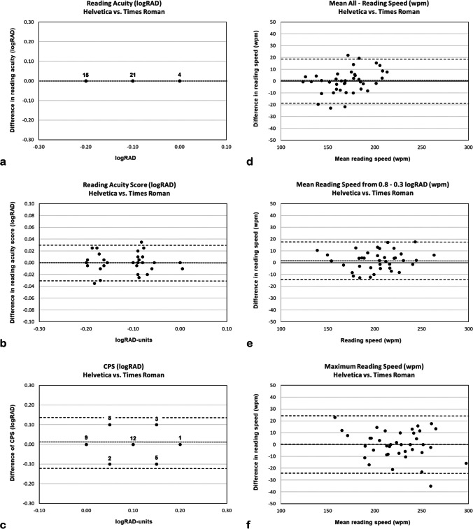 Results: The RA values obtained for the Helvetica and Times Roman fonts (in full logarithmic units of 0.1 logRAD) did not differ between the two fonts (mean for both fonts: - 0.128 ± 0.064 logRAD; 95% CI for both: - 0.148; - 0.107 logRAD). The differences in all other reading parameters between the two fonts were small and not statistically significant. The analyses revealed narrow confidence intervals and good coefficients of reliability. Except for the CPS (r = 0.49) and RA (equal for Helvetica and Times Roman), the correlations for all parameters were high, ranging from r = 0.92 to r = 0.98.