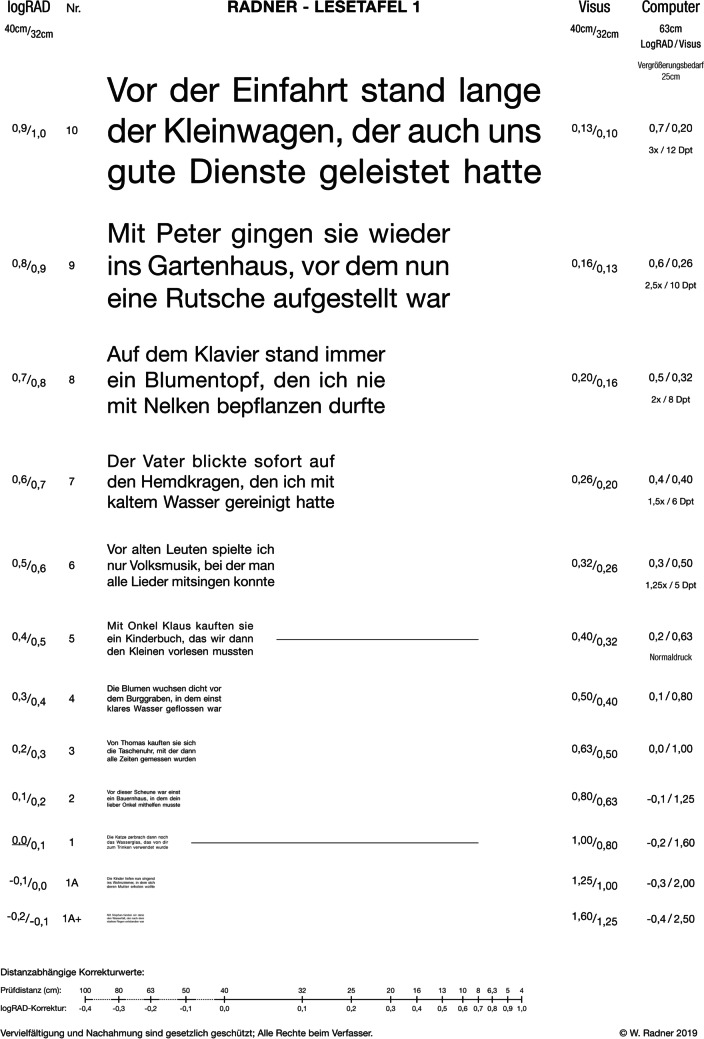 W. Radner receives royalties for the Radner Reading Charts. All other authors have no financial or non-financial interests to disclose. The authors certify that they have no affiliation with or involvement in any organization or entity with any financial interest (such as honoraria; educational grants; participation in speakers’ bureaus; membership, employment, consultancies, stock ownership, or other equity interest; and expert testimony or patent licensing arrangements) or non-financial interest (such as personal or professional relationships, affiliations, knowledge, or beliefs) in the subject matter or materials discussed in this manuscript.