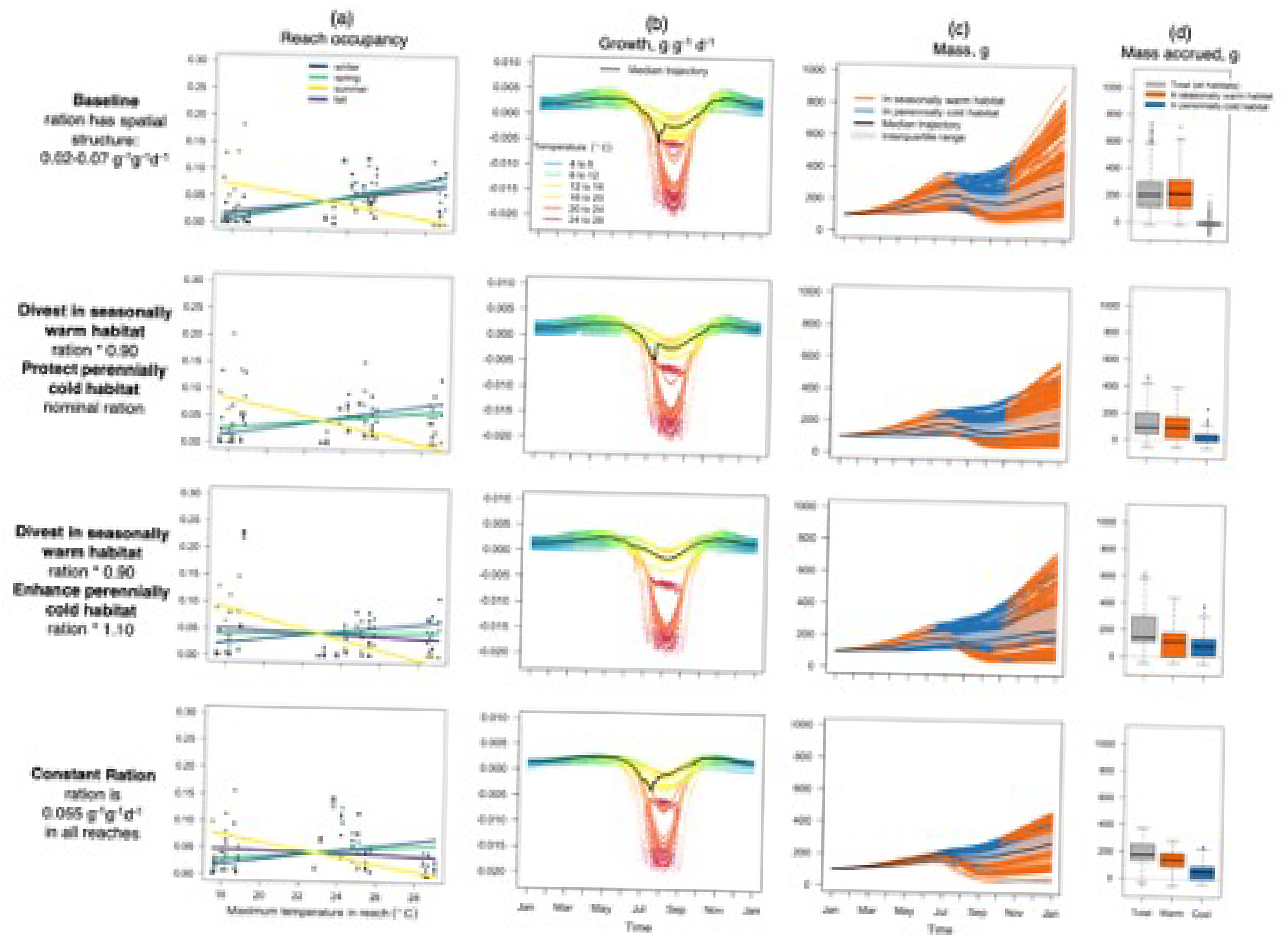 A common goal of biological adaptation planning is to identify and prioritize locations that remain suitably cool during summer. This implicitly devalues areas that are ephemerally warm, even if they are suitable most of the year for mobile animals. Here we develop an alternative conceptual framework, the growth regime, which considers seasonal and landscape variation in physiological performance, focusing on riverine fish. Using temperature models for 14 river basins, we show that growth opportunities propagate up and down river networks on a seasonal basis, and that downstream habitats that are suboptimally warm in summer may actually provide the majority of growth potential expressed annually. We demonstrate with an agent-based simulation that shoulder-season use of warmer downstream habitats can fuel annual fish production. Our work reveals a synergy between cold and warm habitats that could be fundamental for supporting coldwater fisheries, highlighting the risk in conservation strategies that underappreciate warm habitats.