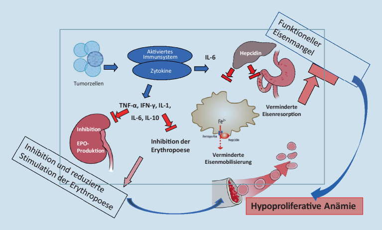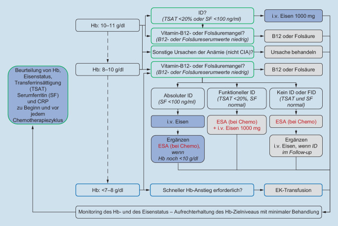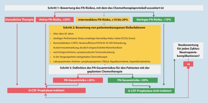 Infektionen bei neutropenischen Patienten nach Chemotherapie manifestieren sich meistens durch Fieber (febrile Neutropenie, FN). Zu den wichtigsten Determinanten des FN-Risikos gehören der Chemotherapietyp, die Dosisintensität und patientenspezifische Faktoren. Bei einem FN-Risiko von 20 % oder höher wird die Granulopoese nach der Therapie prophylaktisch mit G‑CSF („granulocyte colony-stimulating factor“) stimuliert. Eine Anämie sollte immer abgeklärt und falls erforderlich entsprechend ihrer Ursache bei Anämiebeschwerden behandelt werden. Wenn ein absoluter oder funktioneller Eisenmangel vorliegt, dann ist meistens eine intravenöse (i.v.) Eisensubstitution erforderlich. Erythropoesestimulierende Substanzen können nach Chemotherapie bei Hämoglobin(Hb)-Werten unter 10 g/dl (6,2 mmol/l) verwendet werden. Bei chronischer Anämie und Hb-Werten unter 8–7 g/dl (< 5,0–4,3 mmol/l) sollte die Indikation für die Transfusion von Erythrozytenkonzentraten primär anhand der individuellen klinischen Symptomatik gestellt werden.