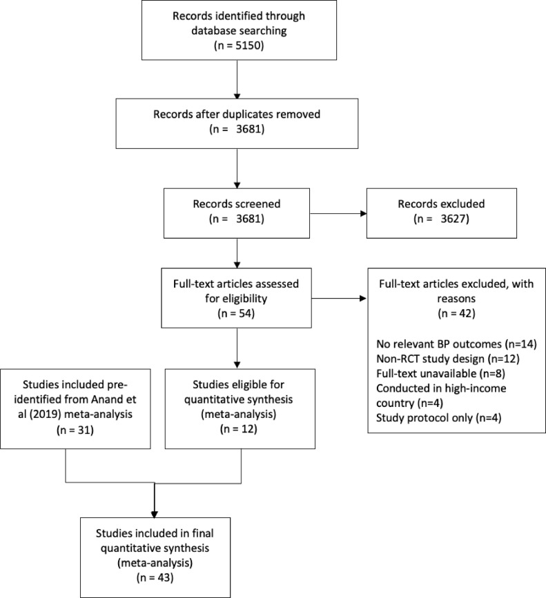Methods: We searched PubMed, Embase, Cochrane, and CINAHL for newer articles on task-sharing interventions to manage hypertension in LMICs. Levels of tasks complexity performed by healthcare workers added to the clinical team in hypertension control programs were categorized as administrative tasks (level 1), basic clinical tasks (level 2), and/or advanced clinical tasks (level 3). Meta-analysis using an inverse variance weighted random-effects model summarized trial-based evidence on the efficacy of team-based care on BP control, compared with usual care.