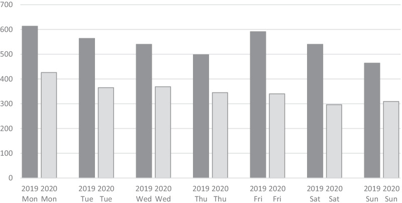 Conclusions: Our analysis revealed that demographic and clinical profiles of patients admitted during weekends do not differ significantly from workdays, but the therapeutic strategy may be different probably due to lack of availability of services and skillsets during weekends. The first wave of the COVID-19 pandemic did not impact on this difference.