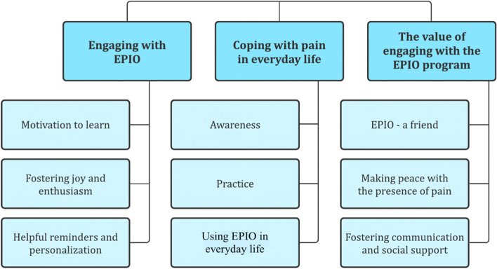 Results: Findings identifying program-related experiences and engagement were organized into three main topics, each with three sub-themes: (1) Engaging with EPIO; motivation to learn, fostering joy and enthusiasm, and helpful reminders and personalization, (2) Coping with pain in everyday life; awareness, practice and using EPIO in everyday life, and (3) The value of engaging with the EPIO program; EPIO - a friend, making peace with the presence of pain, and fostering communication and social support.