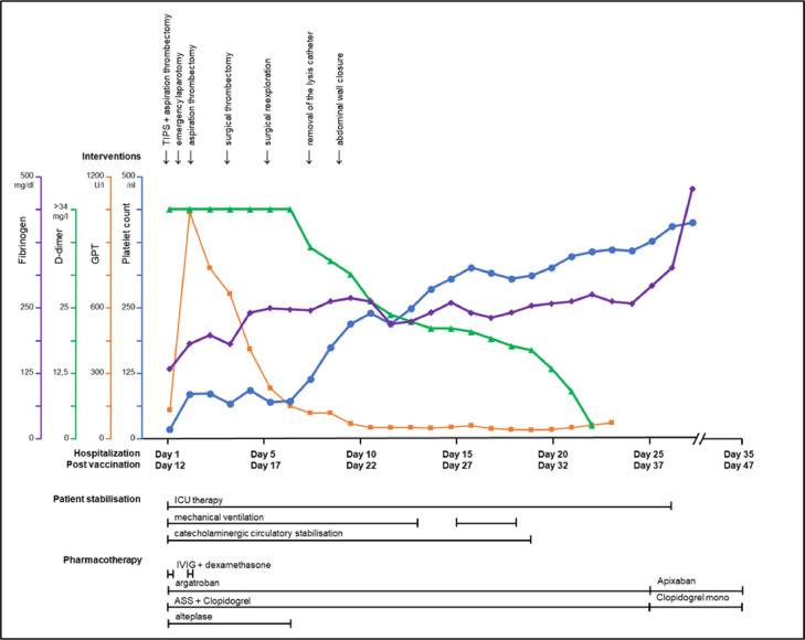 Despite one of the largest vaccination campaigns in human history, the COVID-19 pandemic has not been yet defeated. More than 10 billion doses of COVID-19 vaccine have been administered worldwide. AstraZeneca's Vaxzevria (ChAdOx1 nCoV-19 / AZD1222) was approved as the first viral vector-based vaccine in the EU on 29 January 2021. Thromboembolic events are a rare complication of vaccination with ChAdOx1 nCoV-19 in the context of, now known as vaccine-induced immune thrombotic thrombocytopenia (VITT), with an incidence of 1.5-3 in 100,000 vaccinations. VITT is clinically as well as pathophysiologically comparable to heparin-induced thrombocytopenia. Illustrated by a fulminant patient case, a multidisciplinary step-by-step guideline was developed for the recognition, diagnosis, and management of patients with severe acute portosplanchic venous thrombosis with mesenteric ischemia due to vaccine-induced immunogenic thrombotic thrombocytopenia.