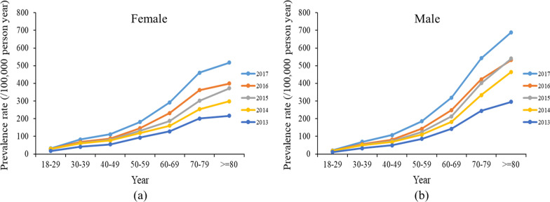 Methods: We conducted a population-based study using data between 2013 and 2017 from the national databases of Urban Employee Basic Medical Insurance and Urban Resident Basic Medical Insurance in China. Data from over 380 million patients aged 18 years and older during the study period were analyzed, and a total of 383,926 bronchiectasis patients were identified. Primary outcomes included the age- and sex-specific prevalence of bronchiectasis. Annual visits and hospitalizations, as well as annual costs were also calculated.