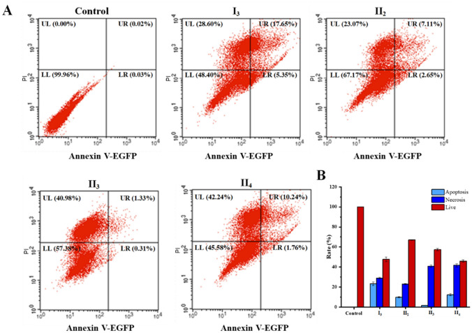 Methods: The photophysical properties and singlet oxygen generation rates of 5,15-diaryl-10,20-dihalogeno porphyrins (I1-6, II1-4) were tested. The cytotoxicity of I1-6 and II1-4 were measured by MTT assay. The pathway of cell death was studied by flow cytometry. In vivo photodynamic efficacy of I3 and II2-4 in Eca-109 tumor-bearing BABL/c nude mice were measured and histopathological analysis were examined.