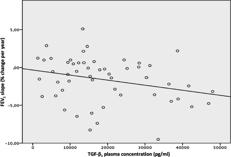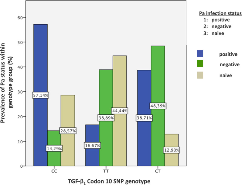 Results: The homozygous TT genotype at codon 10 was associated with a lower rate of chronic Pa infection (p < 0.05). The heterozygous GC genotype at codon 25 was associated with lower lung function decline (p < 0.05). Patients with homozygous TT genotype at the promotor SNP showed higher levels of TNF-α (p < 0,05). Higher levels of TGF-β1 in plasma were associated with a more rapid FEV1 decline over five years (p < 0.05).