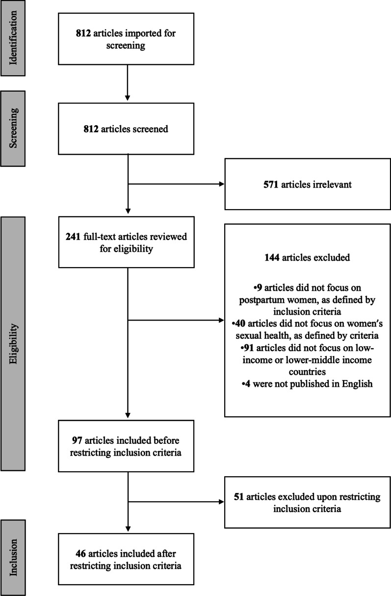 Methods: Articles eligible for review were those that investigated women's sexual health during the first 12 months postpartum and were conducted among women aged 15-49 in LMICs. Eligibility was further restricted to studies that were published within the last 20 years (2001-2021). The initial PubMed search identified 812 articles, but upon further eligibility review, 97 remained. At this time, the decision was made to focus this review only on articles addressing sexual function and/or dysfunction, which yielded 46 articles. Key article characteristics were described and analyzed by outcome.