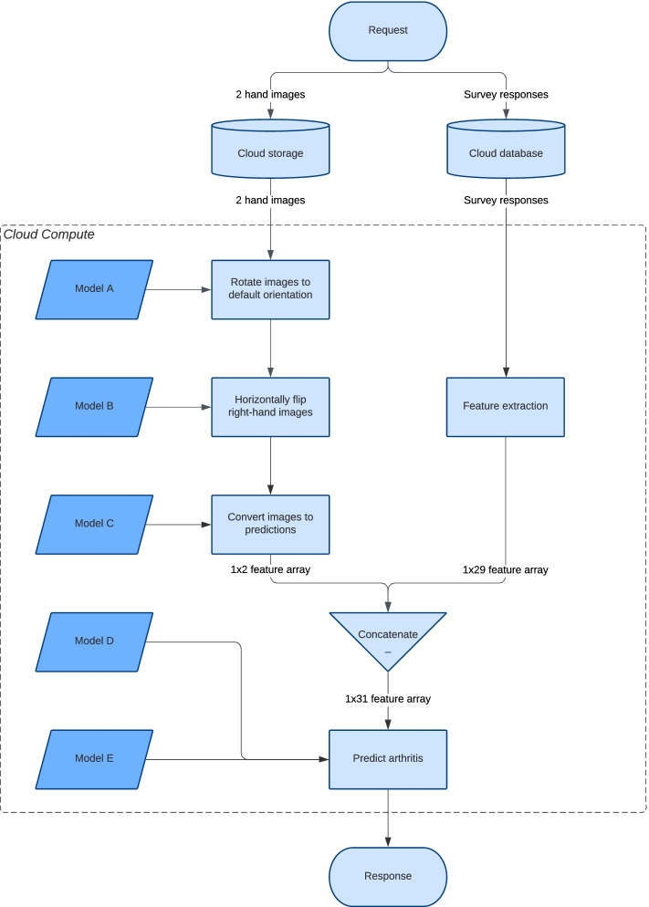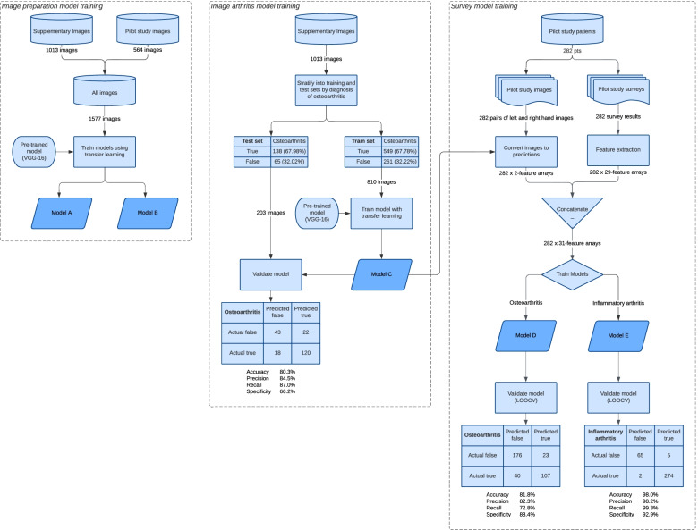 Methods: Two hundred and forty-eight consecutive new patients presenting to 7 private Rheumatology practices across Australia were enrolled. Using a smartphone application, each patient had photographs taken of their hands, completed a brief 9-part questionnaire, and had a single examination result (wrist irritability) recorded. The Rheumatologist diagnosis was entered following a 45-minute consultation. Multiple machine learning models were applied to both the photographic and survey/examination results, to generate a screening outcome for the primary diagnoses of osteoarthritis, rheumatoid and psoriatic arthritis.