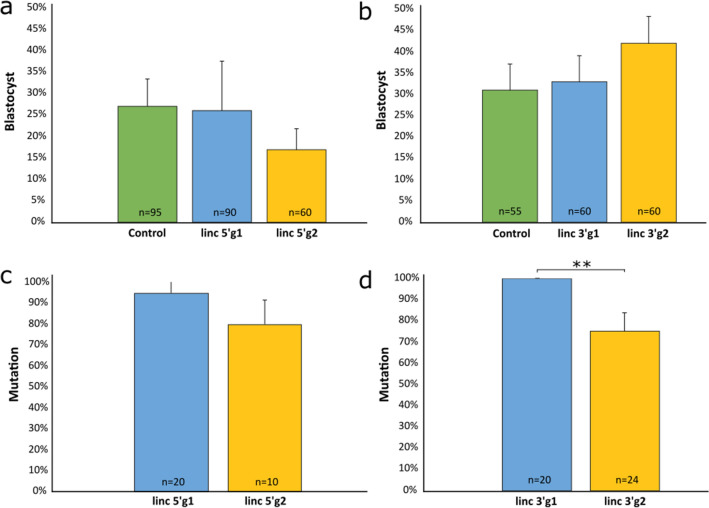 A long intergenic non-coding RNA (lincRNA#1) is overexpressed in the horn bud region of polled (hornless) bovine fetuses, suggesting a potential role in horn bud suppression. Genome editing was used to test whether the absence of this sequence was associated with the horned phenotype. Two gRNAs with high mutation efficiencies targeting the 5' and the 3' regions flanking the lincRNA#1 sequence were co-injected with Cas9 as ribonucleoprotein complexes into bovine zygotes (n = 121) 6 h post insemination. Of the resulting blastocysts (n = 31), 84% had the expected 3.7 kb deletion; of these embryos with the 3.7 kb deletions, 88% were biallelic knockouts. Thirty-nine presumptive edited 7-day blastocysts were transferred to 13 synchronized recipient cows resulting in ten pregnancies, five with embryos heterozygous for the dominant PC POLLED allele at the POLLED locus, and five with the recessive pp genotype. Eight (80%) of the resulting fetuses were biallelic lincRNA#1 knockouts, with the remaining two being mosaic. RT-qPCR analysis was used to confirm the absence of lincRNA#1 expression in knockout fetuses. Phenotypic and histological analysis of the genotypically (PCp) POLLED, lincRNA#1 knockout fetuses revealed similar morphology to non-edited, control polled fetuses, indicating the absence of lincRNA#1 alone does not result in a horned phenotype.
