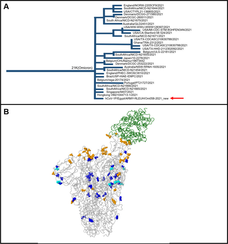 Main text: This report identifies the first Egyptian patient with a confirmed SARS-CoV-2 omicron variant. The patient showed positivity on reverse transcriptase-polymerase chain reaction and full genome sequencing was performed to confirm the variant. The mutations found in the variant were compared with the GISAID reference strain hCoV-19/Wuhan/WIV04/2019. Genome BLAST showed the highest similarity to omicron variants isolated in South Africa. Phylogenetic analysis revealed that the variant belongs to the 21K clade.